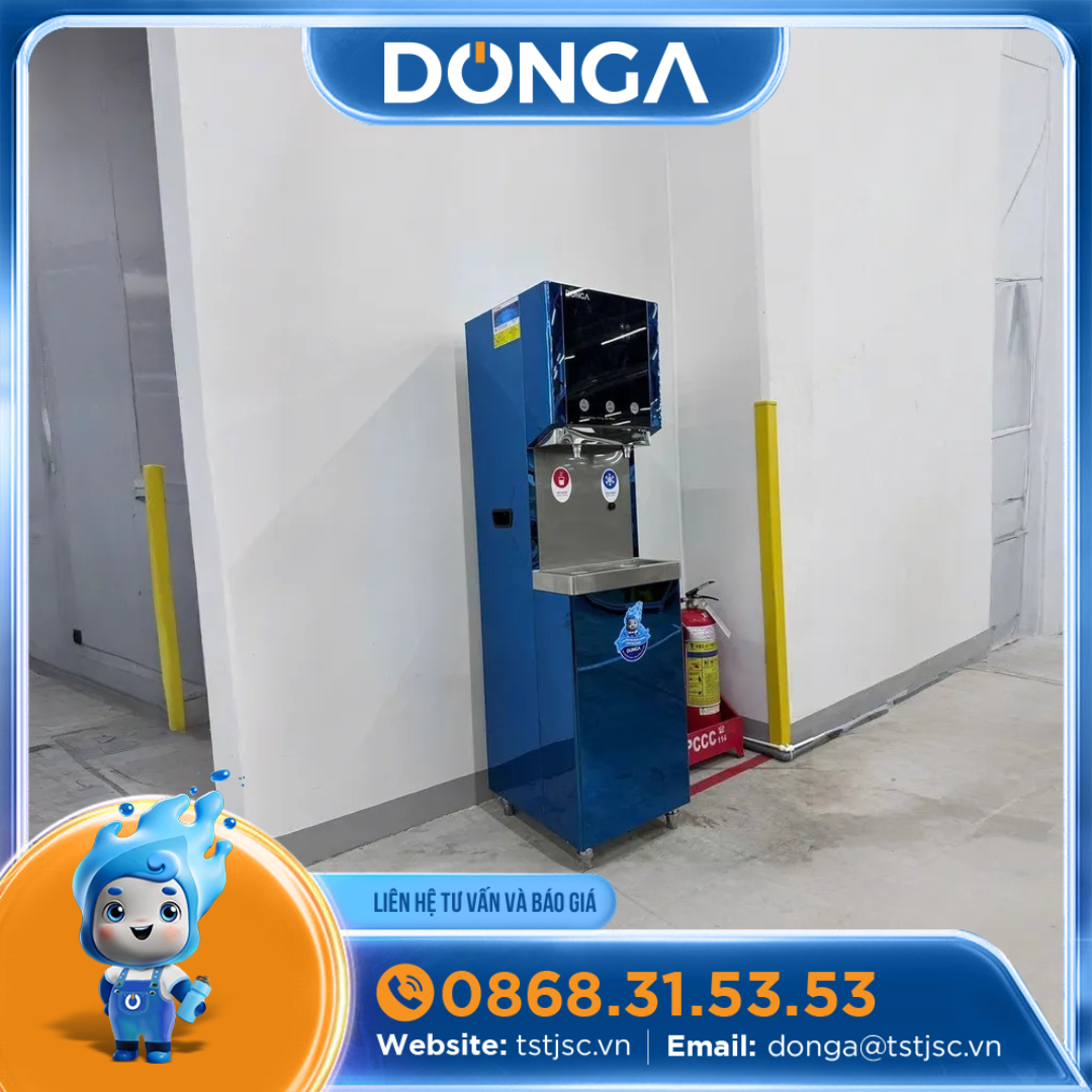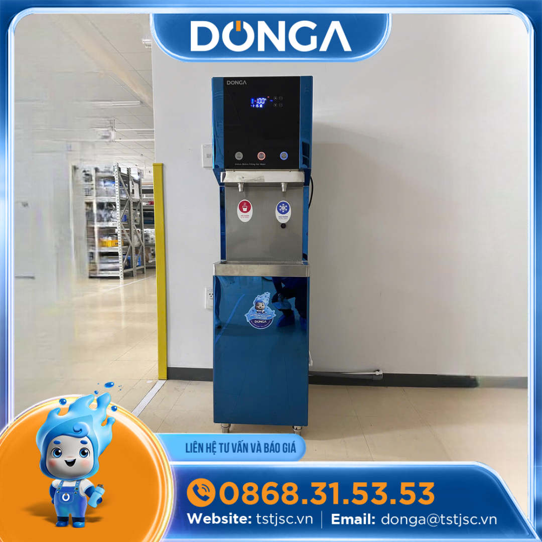 - Máy lọc nước nóng lạnh công nghiệp DONGA được thiết kế có chân đế máy có thể đặt trực tiếp xuống mặt đất, với hai vòi lấy nước nóng và khay hứng nước thừa được thiết kế phù hợp sử dụng lượng nước nóng lớn.